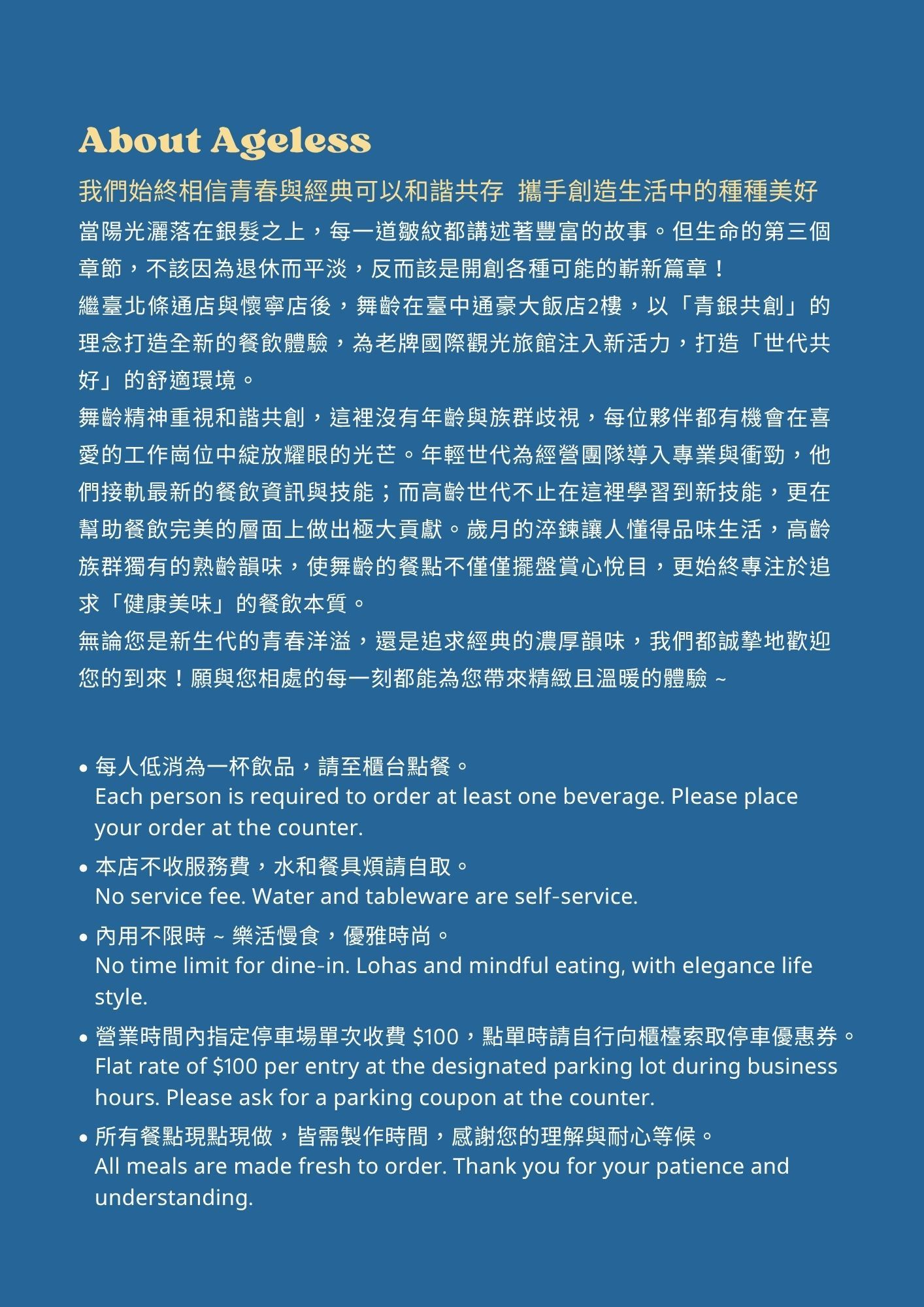 「Ageless Restaurant 舞齡餐廳」以白色為基調,典雅而舒適的氛圍,寬敞明亮的環境,現代簡約的風格與柔和燈光讓整個空間更加溫暖宜人,無論是精心製作的餐點,還是伴著爵士樂啜飲一杯搭餐好酒,這裡都是理想的選擇。我們不僅提供精緻的餐食與高品質的咖啡及各式特色飲品,還有侍酒師精選的搭餐紅白酒,是一個讓人重拾心靈平靜的場所,歡迎您與親友相伴或獨自前來享受一段美好時光~