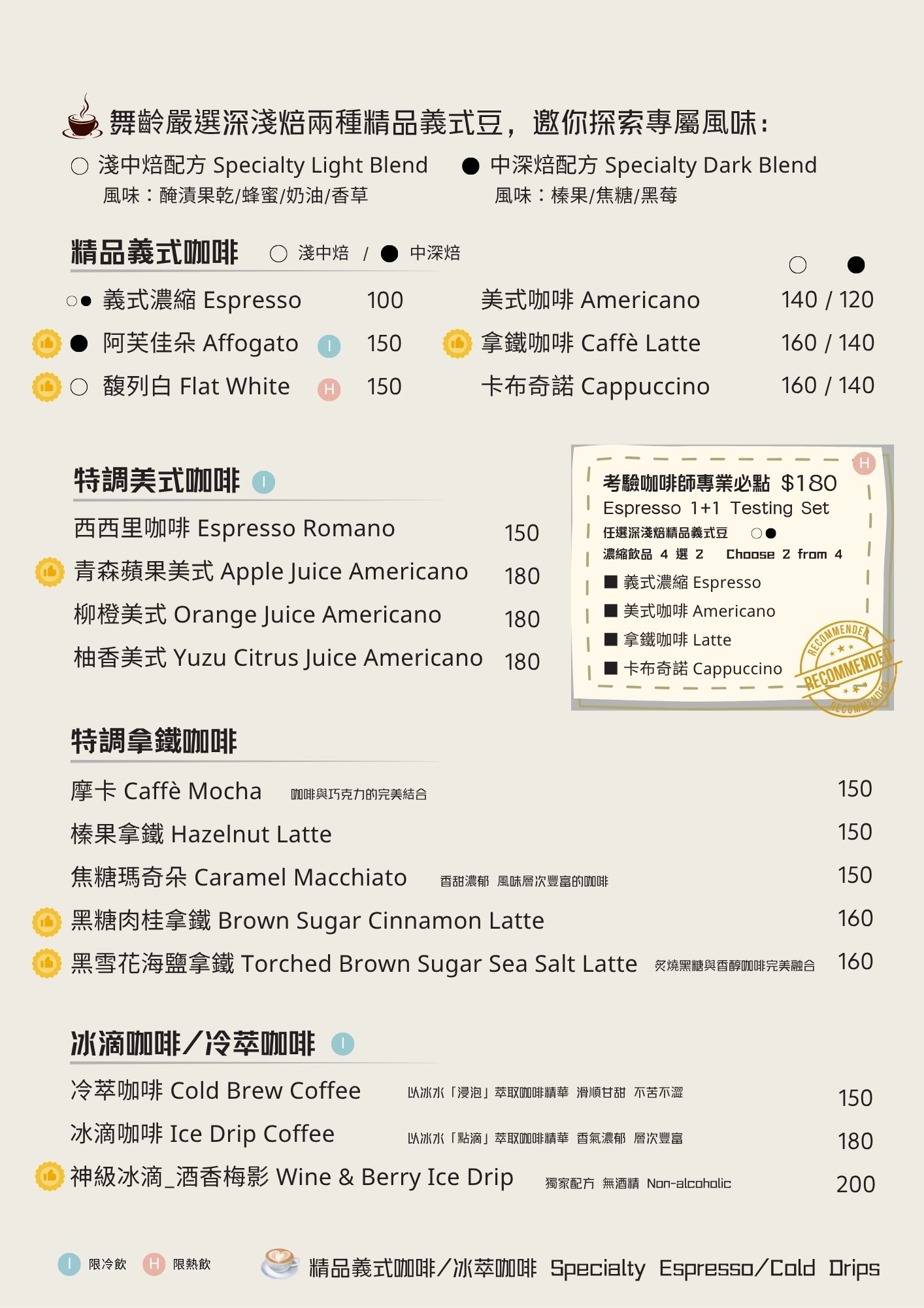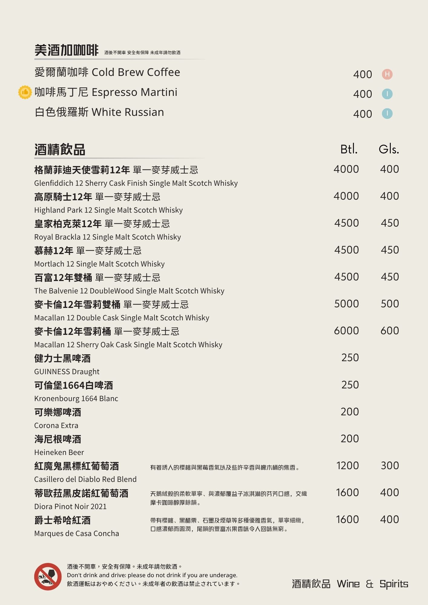 供應世界級專業精品咖啡、紅白酒、威士忌、各種精心製作特調飲品、美味餐點、可口甜點。